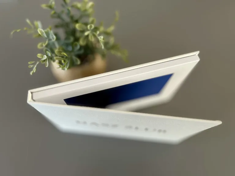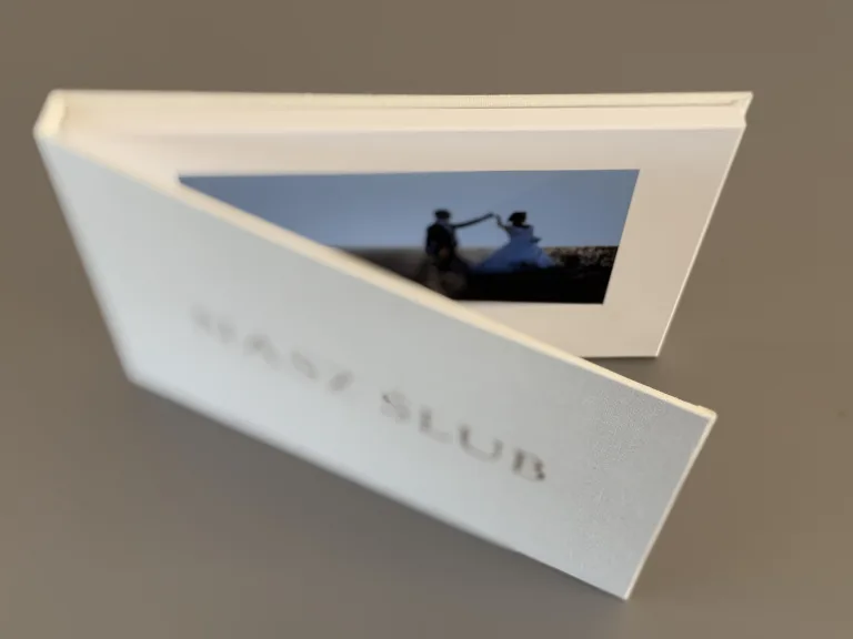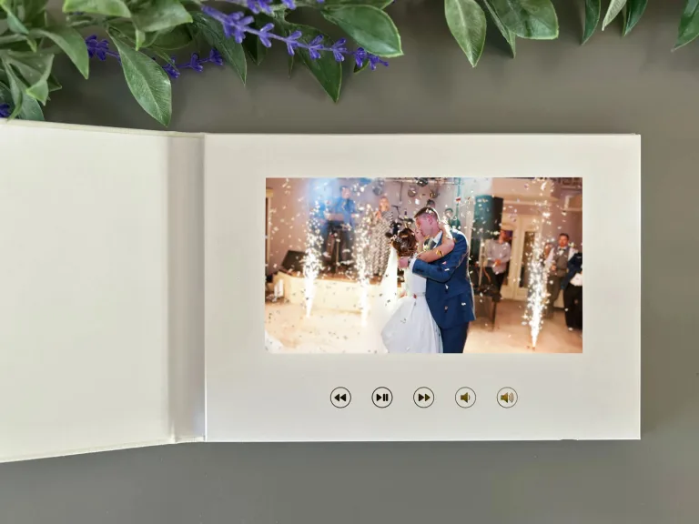 Wystarczy otworzyć okładkę, by film zaczął odtwarzać się automatycznie, przywołując obrazy, dźwięki i emocje tego wyjątkowego dnia. W eleganckiej formie przypominającej książkę kryje się ekran LCD oraz głośnik, które ożywiają wspomnienia w najwyższej jakości.