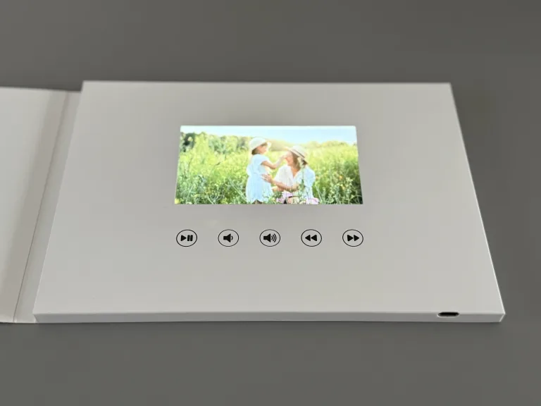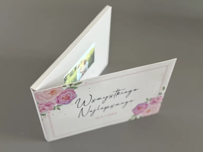 W naszym Video Albumie łączymy radość wspólnych chwil z nowoczesną technologią. Wyposażony jest on w ekran HD, głośnik, kartę pamięci oraz wszystko co niezbędne aby odtworzyć nagrane wcześniej życzenia lub Wasze wspólne wspomnienia.