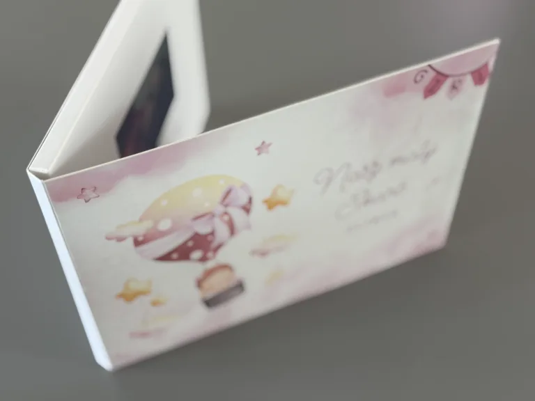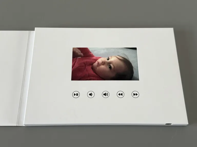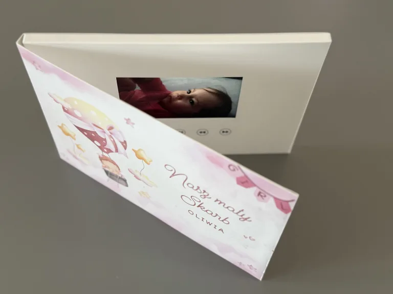 Nasz video album to połączenie wzruszających wspomnień z nowoczesną technologią. Wyposażony w ekran HD, głośnik i kartę pamięci, pozwala w wyjątkowy sposób odtwarzać nagrane gratulacje dla rodziców, pierwsze filmy i zdjęcia córeczki.