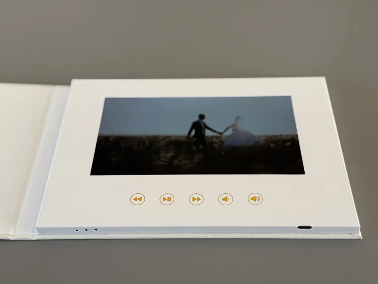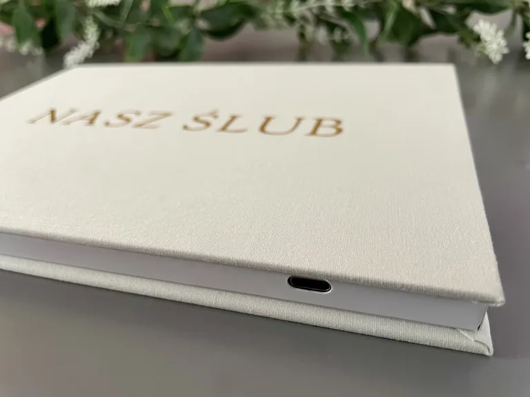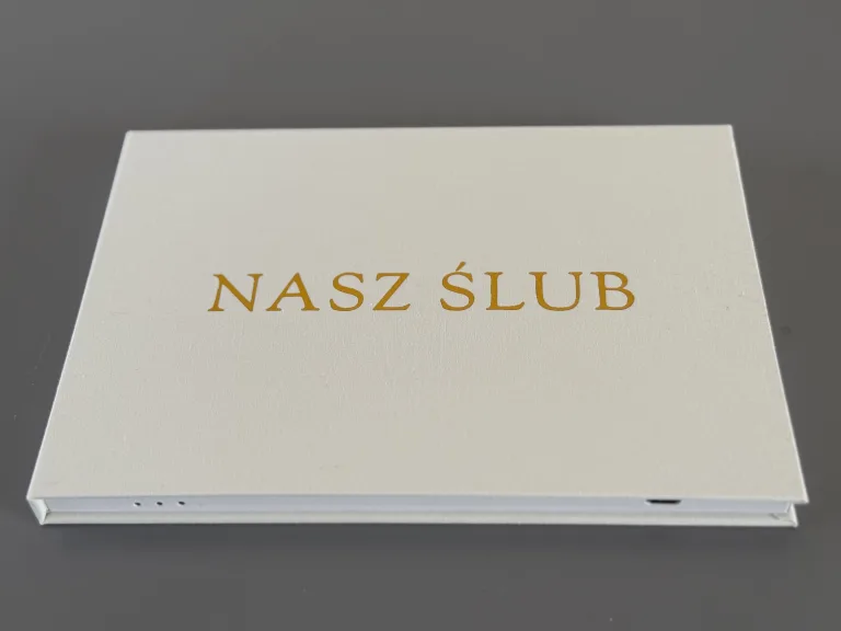 W naszym wyjątkowym produkcie łączymy magiczną siłę wspomnień z nowoczesną technologią. Wyposażony w duży ekran o przekątnej 7 cali oraz rozdzielczości HD pozwala na nowo przeżywać niezapomniane momenty śluby i wesela utrwalone na filmach oraz zdjęciach. Po otwarciu okładki, materiał uprzednio wgrany na urządzenie jest automatycznie odtwarzany. Wgranie plików na urządzenie jest banalnie proste, wystarczy podłączyć urządzenie do komputera i wgrać na nie pliki tak jakbyśmy wgrywali je na pendriva.
